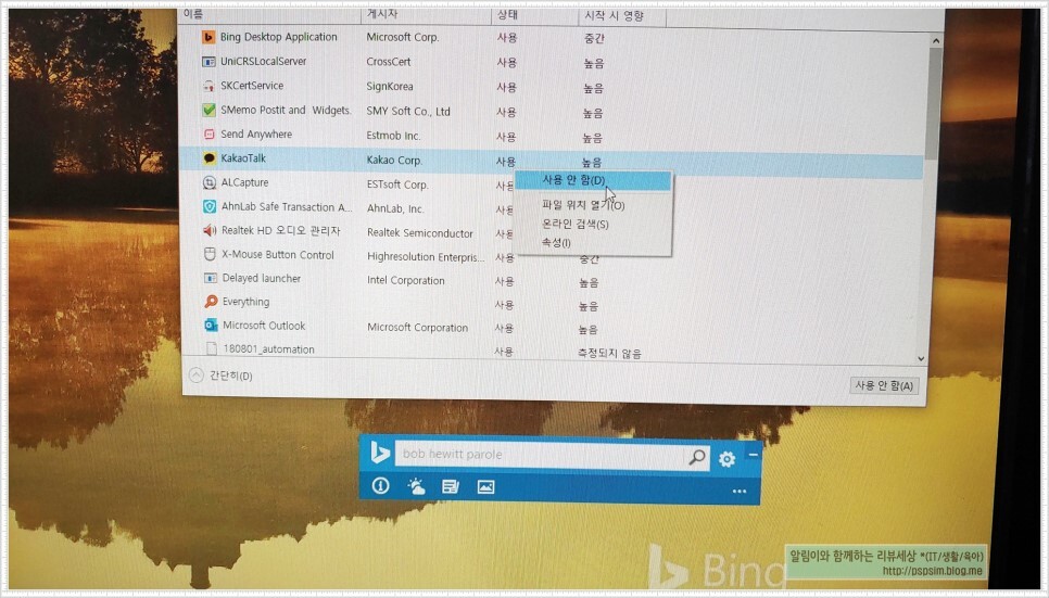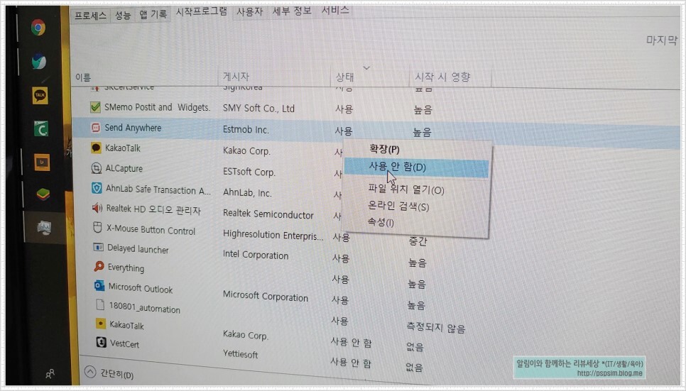 여기서 시작 시 영향이 미치는 요소가 "높음"으로 되어있는 것을 위주로 "사용 안 함"으로 바꿔주시면 윈도우가 부팅할 때 해당 프로그램이 더 이상 자동으로 실행되지 않습니다.