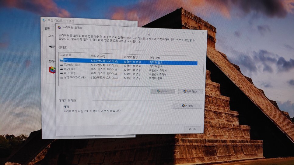 위와 같이 "드라이브 최적화" 화면이 나오면서 최적화할 드라이브를 선택해 주면 됩니다.