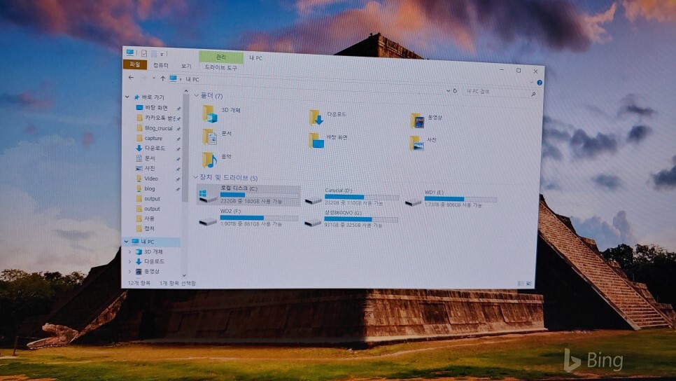 먼저 윈도 탐색기를 실행합니다. 여기서 "장치 및 드라이브"를 보시면 설치된 디스크들을 볼 수가 있습니다.