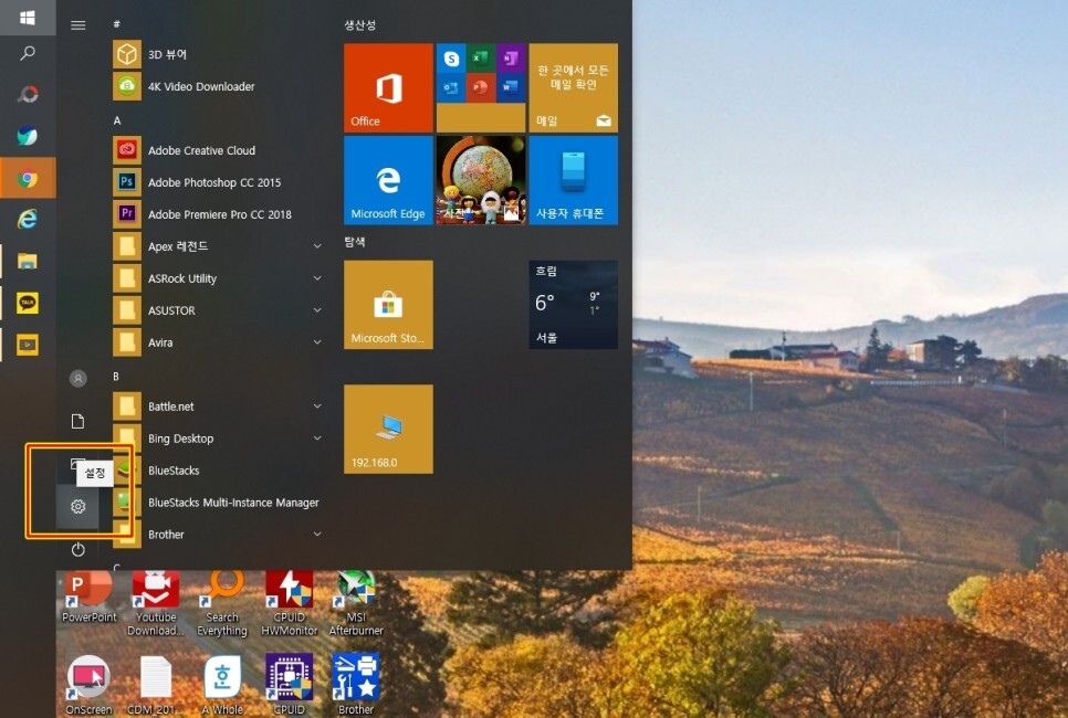 제일 먼저 윈도우 시작키 버튼을 누르면 나오는 메뉴에서 톱니바퀴 모양의 설정을 누르세요.