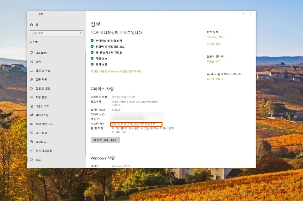 그러면 위와 같이 정보가 나오고 중간쯤에 보면 디바이스 사양이 있고 여기의 시스템 종류에서 확인할 수 있습니다.