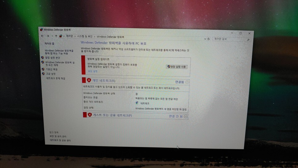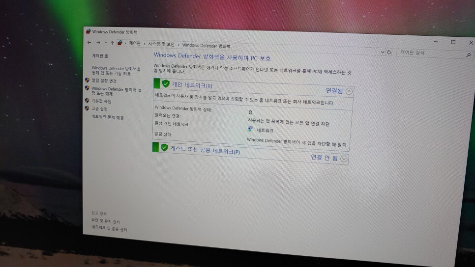 그 다음에 이렇게 windows defender 방화벽 화면으로 이동을 하면서 개인 네트워크가 연결되었고 방화벽 상태가 켜져 있는 상태라는 것을 알 수가 있습니다. 그리고 그 밑에 보시면 게스트 또는 공용네트워크는 연결 안 되므로 표시가 되어 있습니다.