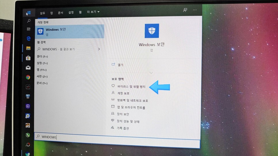 이것은 시작 버튼에서 windows 라고 치면 위와 같은 화면이 나오는데, 여기서 바이러스 및 위협 방지를 눌러줍니다.