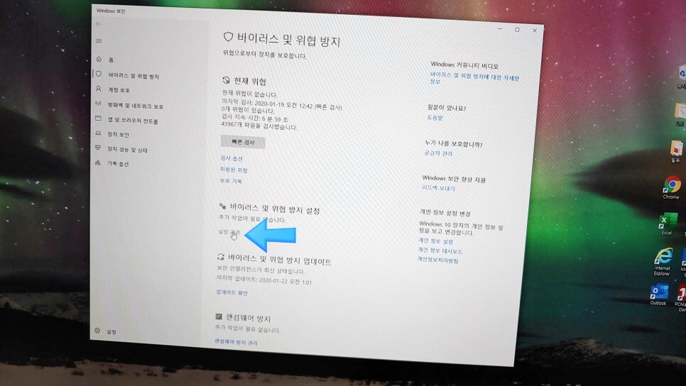 그리고 그다음에 바이러스 및 위협 방지 설정 열기를 눌러 주시고요