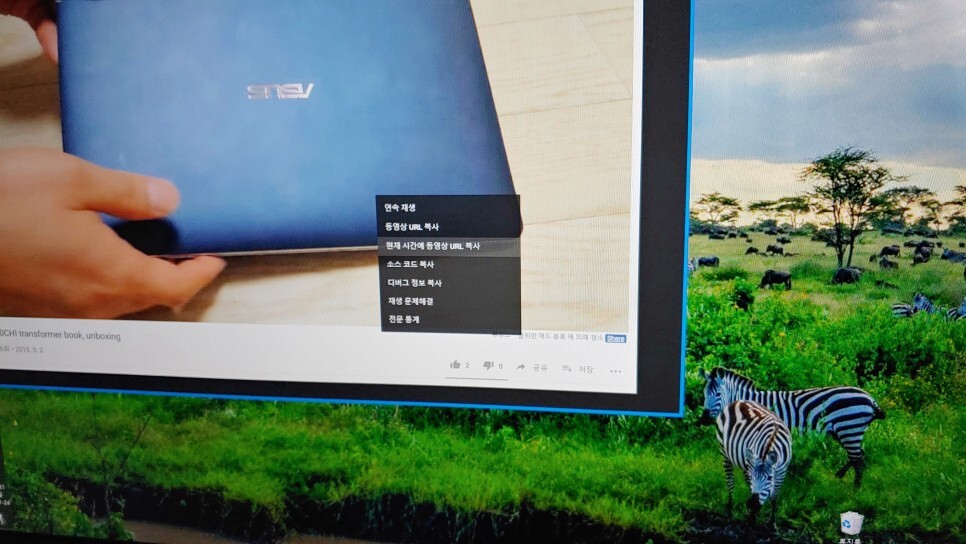 유튜브 동영상을 켜놓고 마우스 우측 버튼을 눌러서 "동영상 URL 복사"를 눌러주시면 됩니다.
