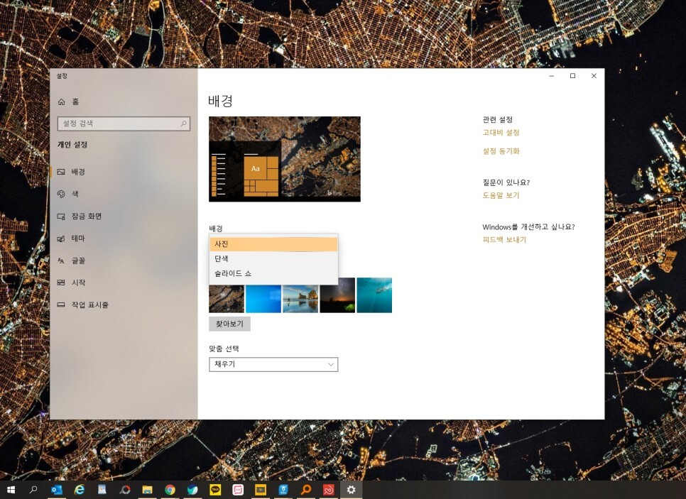 배경 탭을 눌러 주시면 사진, 단색, 슬라이드쇼 이렇게 3가지 옵션이 있습니다.