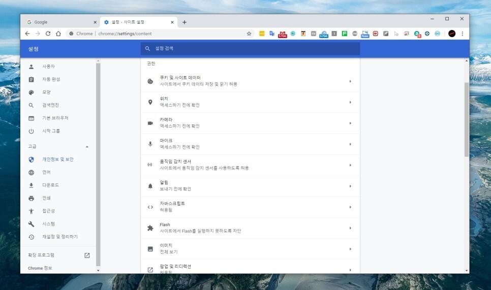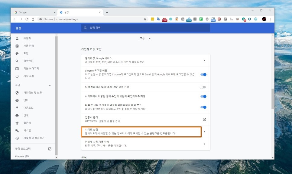 여기에서 “개인정보 및 보안” 섹션이 나오고 여기에 보시면 “사이트 설정”이 있습니다.