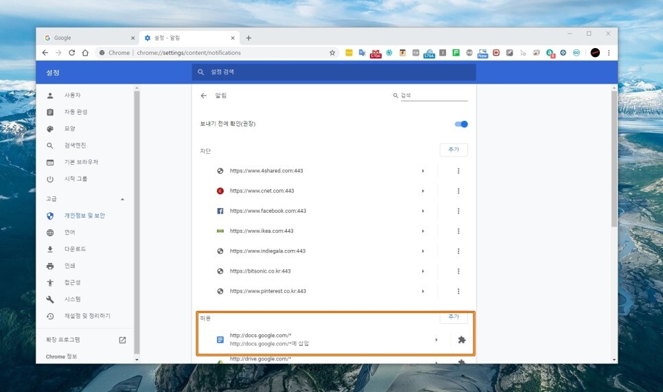 “알림”에 들어가 보면 위와 같이 각 사이트별로 알림을 허용 또는 차단된 주소목록이 나옵니다.