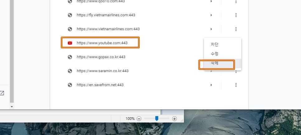 여기에 보시면 “허용” 부분에 youtube가 보일텐데요. 여기서 점세개 버튼을 눌러서 “삭제”를 골라주시면 됩니다.